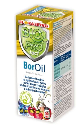A BorOil műtrágya levélpermetként alkalmazható készítmény, bórral táplálja a növényeket és így növeli a terméshozamot és termény minőséget.