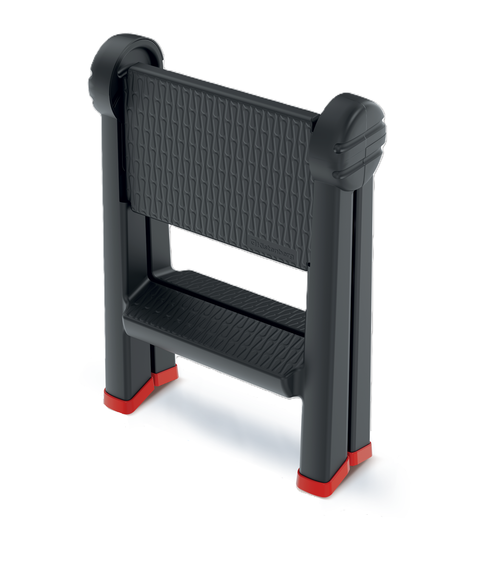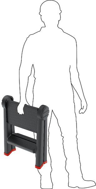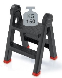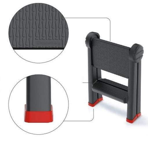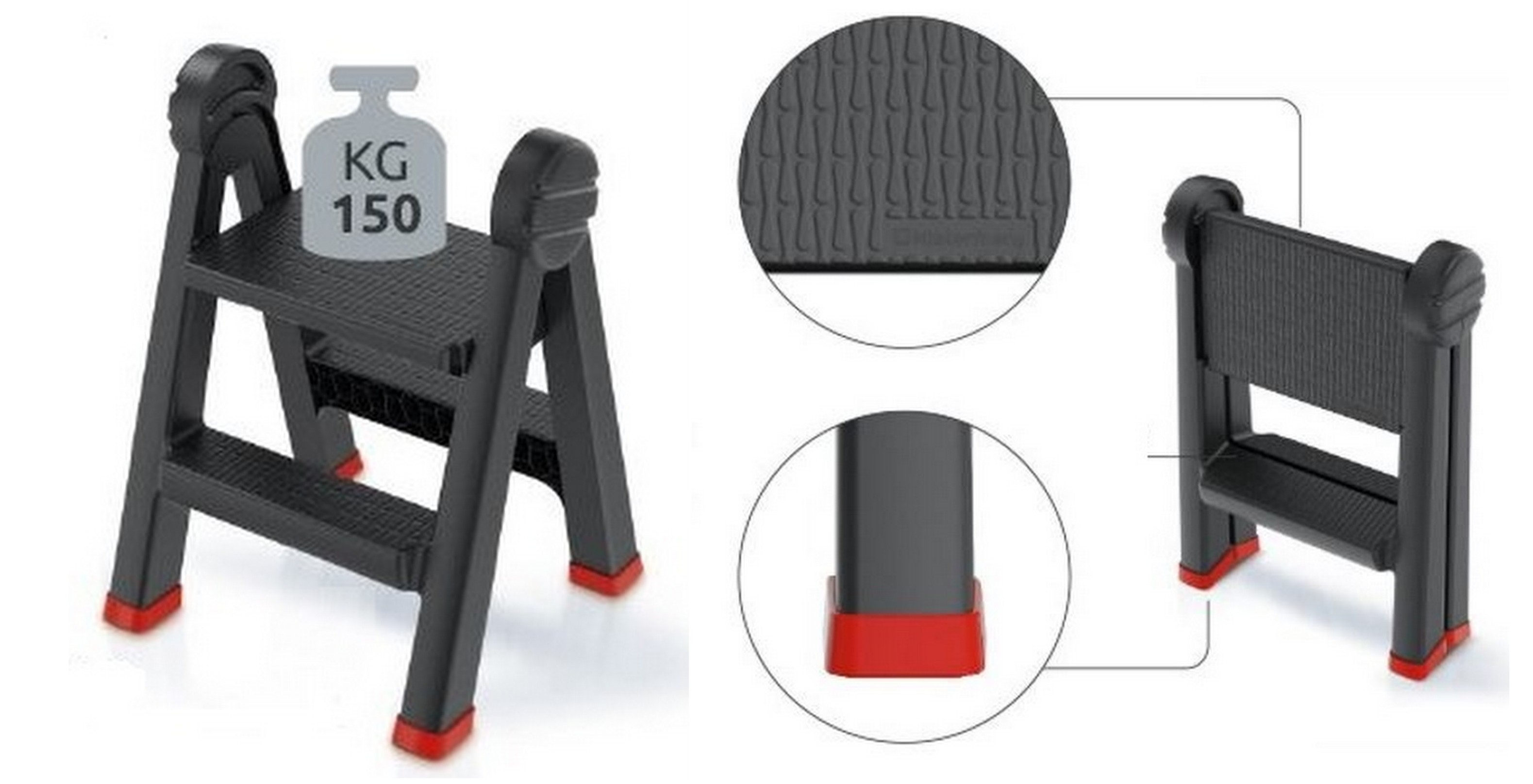 A csúszásmentes fokok és az elasztomer talpak biztonságos állást garantálnak még sima felületen is. Összecsukva minimális helyet foglal, így könnyen tárolható és szállítható.
