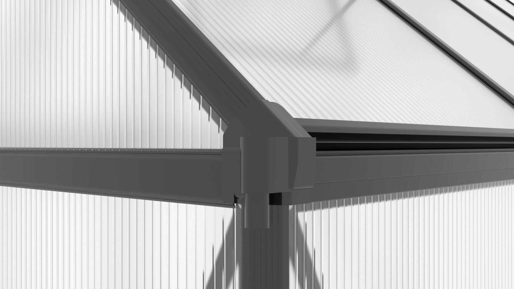 A váz eloxált alumínium profilokból készül, amely garantálja a szilárdságot és a hosszú élettartamot. A polikarbonát táblák alumínium H-profilokba illeszkednek, ami maximális stabilitást biztosít. A megerősített tartóprofilok növelik az üvegház ellenállását a szél- és hóterheléssel szemben. A csomag része egy horganyzott acél alap is, amely megkönnyíti az összeszerelést.