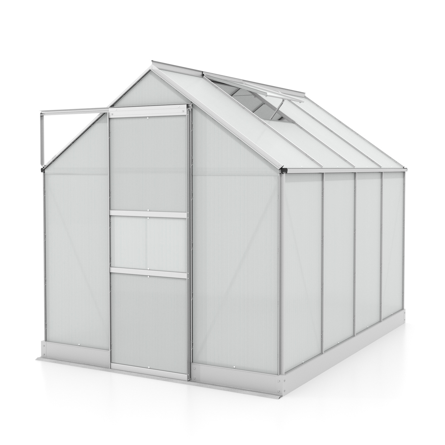 Alumínium üvegház (Sz × H) 195 × 261 cm, ezüst színben, 1× tetőszellőző ablakkal, 4 mm-es polikarbonáttal, tolóajtóval, 5,09 m² alapterülettel.