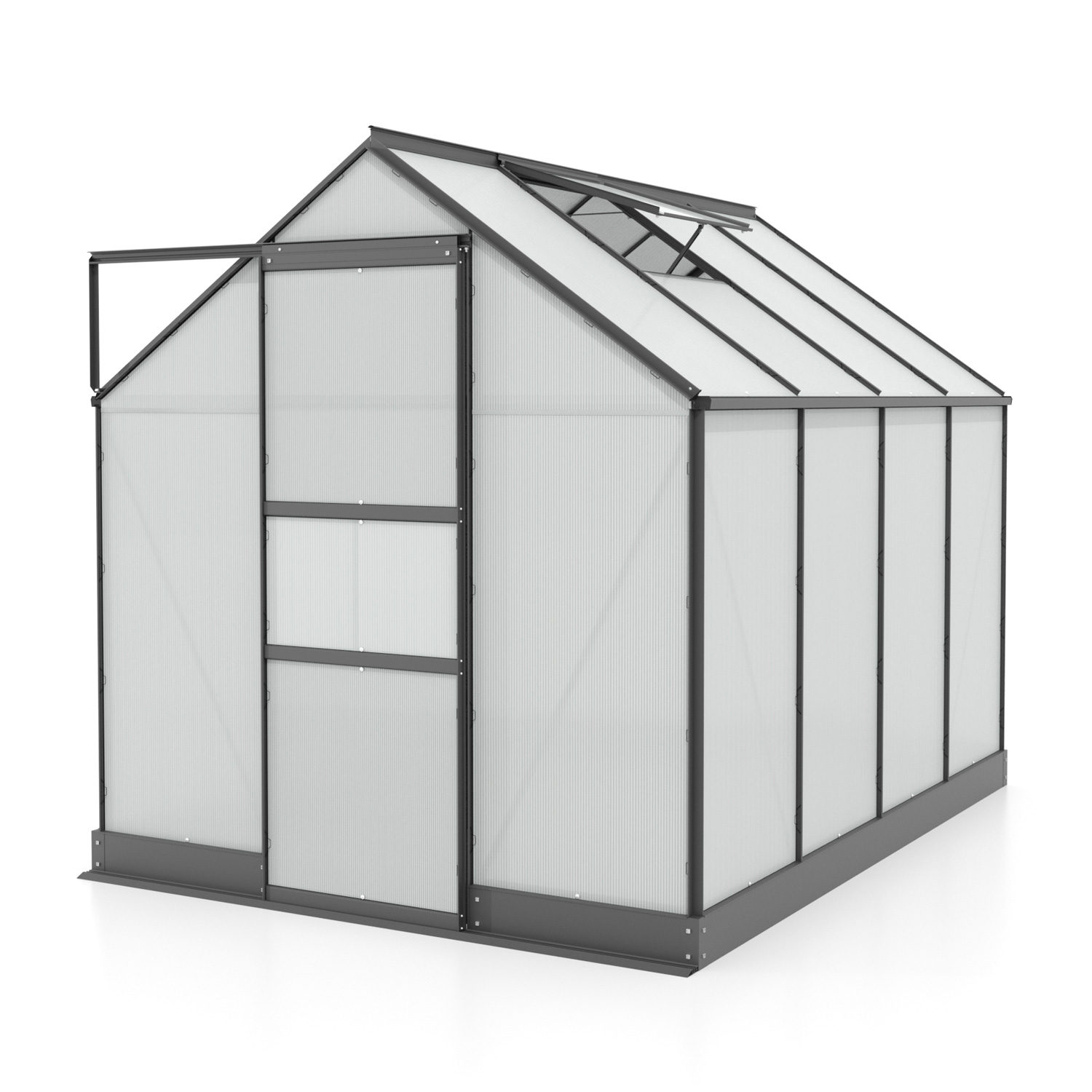 | A csomag tartalma | alumínium szerkezet, polikarbonát panelek, horganyzott acél alapkeret, 1× tetőszellőző ablak, ajtó, rögzítőelemek |