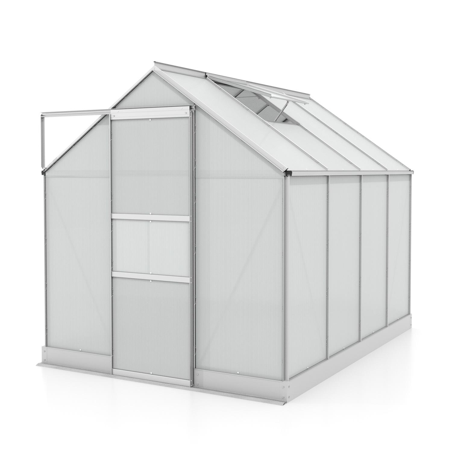 Alumínium üvegház (Sz × H) 195 × 261 cm, ezüst színben, 1× tetőszellőző ablakkal, 6 mm-es polikarbonáttal, tolóajtóval, 5,09 m² alapterülettel.