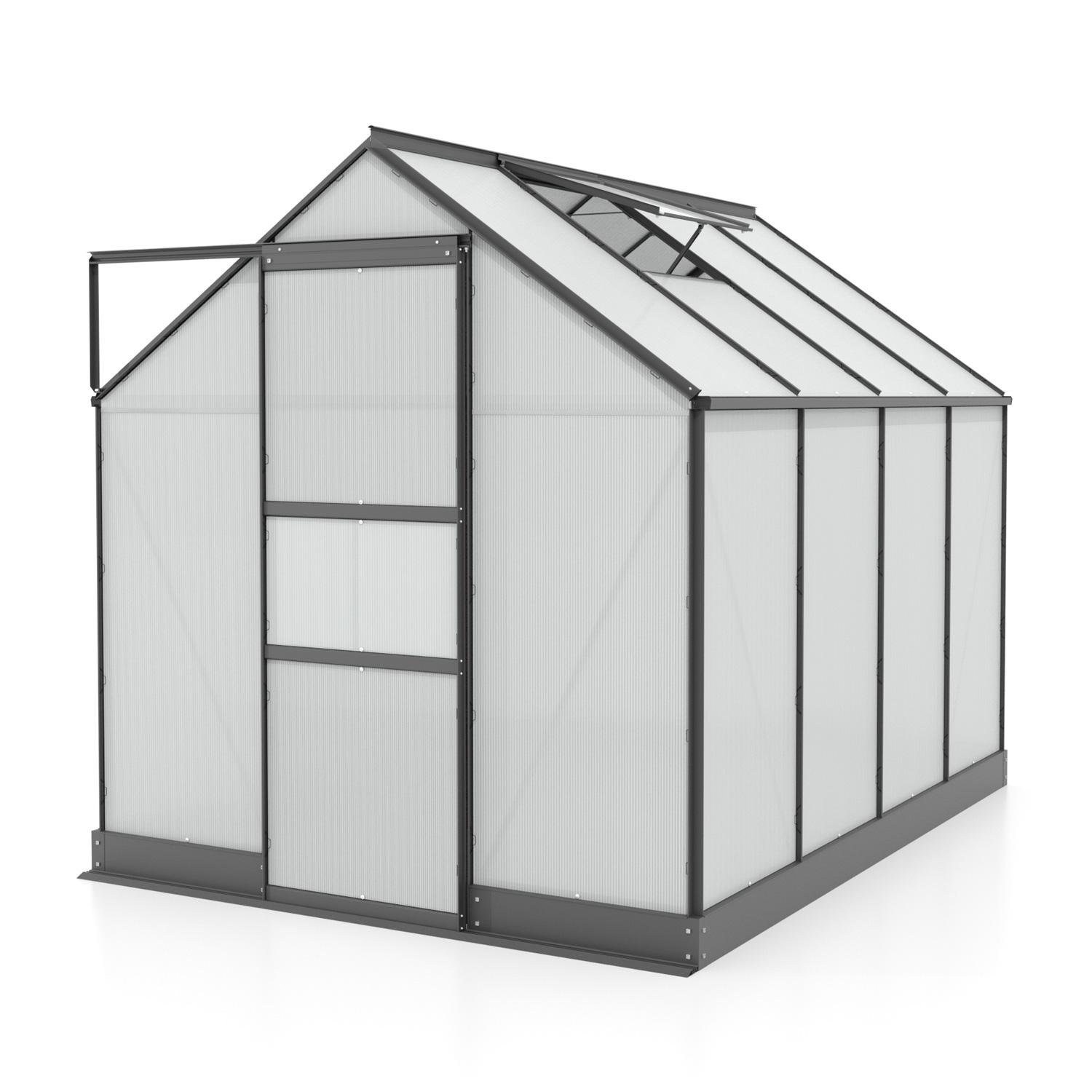 Alumínium üvegház (Sz × H) 195 × 261 cm, fekete színben, 1× tetőszellőző ablakkal, 6 mm-es polikarbonáttal, tolóajtóval, 5,09 m² alapterülettel.