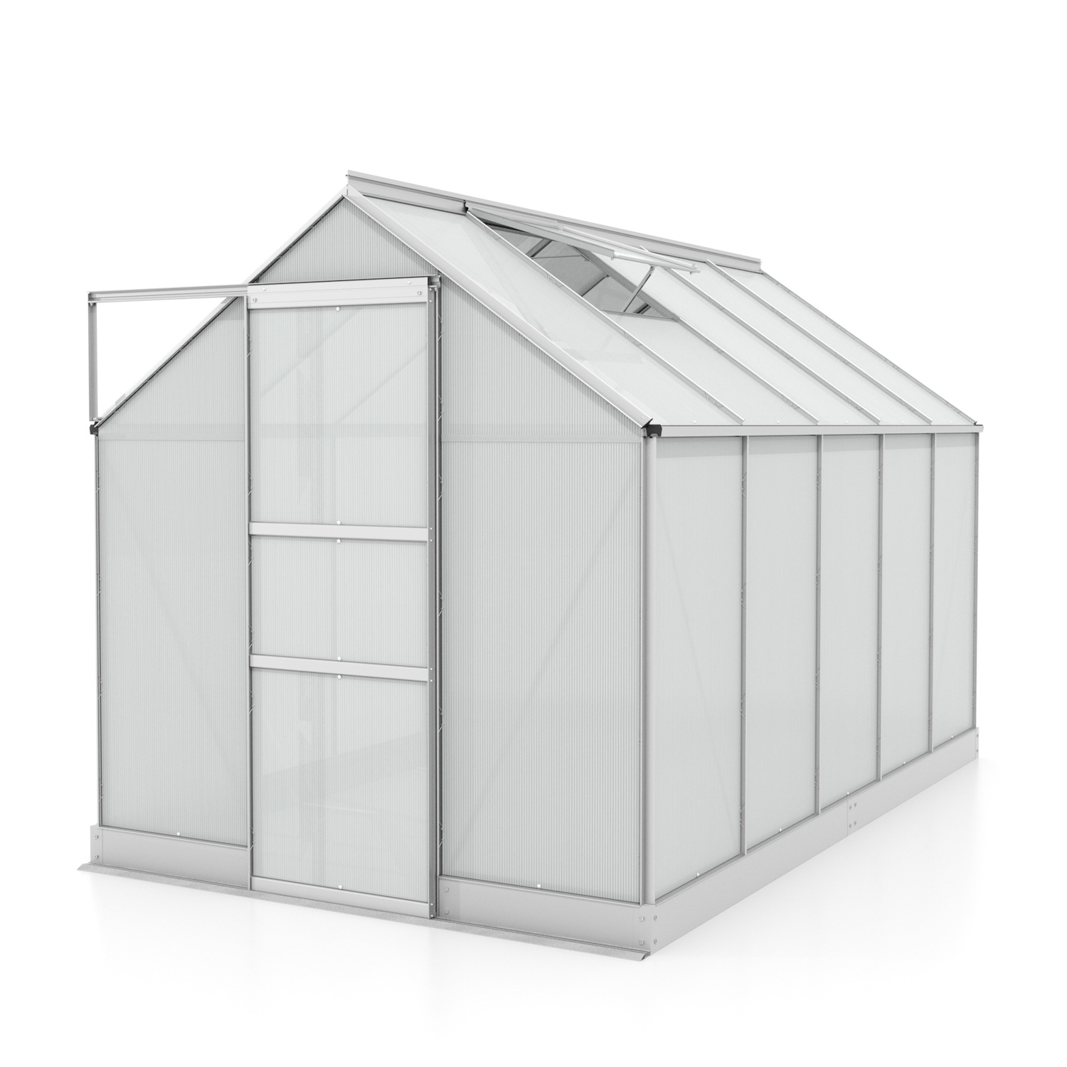 | A csomag tartalma | alumínium szerkezet, polikarbonát panelek, horganyzott acél alapkeret, 1× tetőszellőző ablak, ajtó, rögzítőelemek |