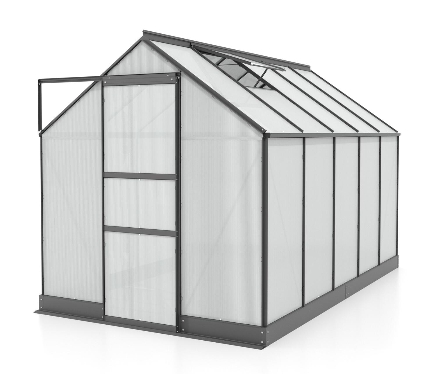 | A csomag tartalma | alumínium szerkezet, polikarbonát panelek, horganyzott acél alapkeret, 1× tetőszellőző ablak, ajtó, rögzítőelemek |